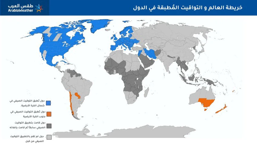 Most of the Arab countries do not apply daylight saving time, the world map and the times applied in the countries are countries that apply daylight saving time in the north of the globe . Countries that implement daylight saving time in the south of the globe Countries that previously implemented daylight saving time and then canceled it Countries that did not implement daylight saving time before the implementation of daylight saving time
