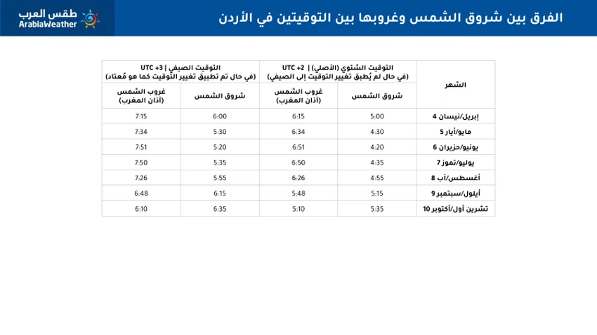 Arab Weather - The official Hashemite Kingdom of Jordan time, which corresponds to the longitude on which the Kingdom is located, is 2 + UTC, meaning that it is two hours more than UTC, and this time is known locally as winter time