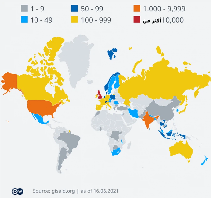 (Nombre d'infections par la variante « delta » du virus Corona dans le monde au 16 juin)