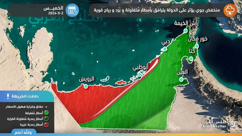 Météo d'Arabie - Sinan Khalaf - Toutes les sorties des systèmes de modélisation informatique pour le mouvement des systèmes météorologiques et les prévisions de pluie sont collectées pour indiquer que diverses régions des Émirats seront touchées jeudi par une nouvelle dépression accompagnée de précipitations, d'averses de grêle et de fortes les vents.