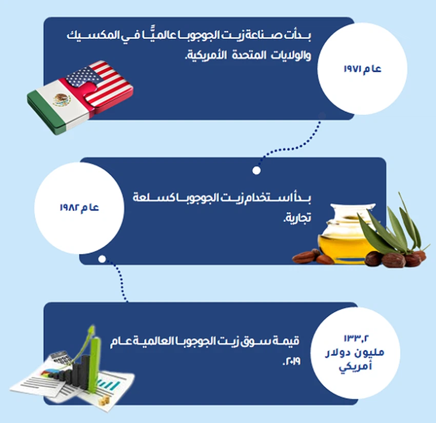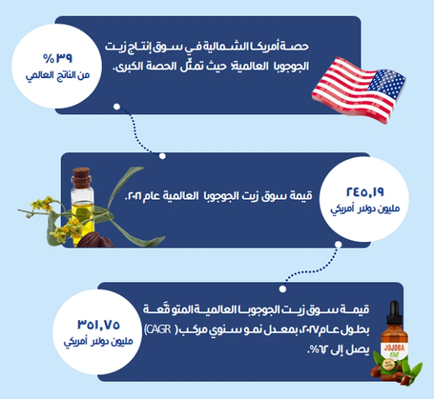 Ce qui suit est un examen de certains faits et chiffres liés à la culture du jojoba dans le monde, et les projets de culture de jojoba en Égypte, ainsi que les avantages tirés de la culture du jojoba, ses utilisations et les gains économiques résultant de sa culture.