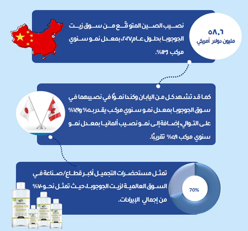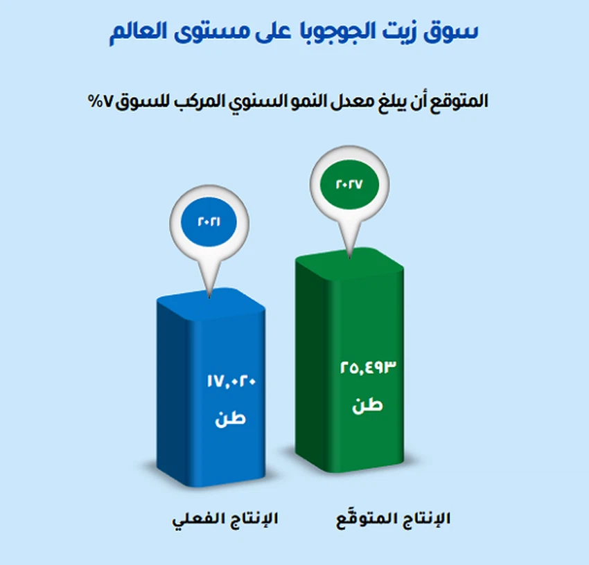 Il convient de noter que l'Égypte est l'un des pays les plus propices à la plantation de jojoba en termes de disponibilité de conditions climatiques et de terres adaptées à sa culture, en plus du faible coût de production de l'huile de Google de 50 % par rapport au reste du pays. Par conséquent, compte tenu de la rentabilité économique de la plante de jojoba, l'Égypte poursuit ses efforts pour augmenter la superficie plantée en jojoba. Au cours des dernières années, ces efforts ont abouti à la diffusion de sa culture dans un certain nombre de gouvernorats et de régions égyptiennes. , dont les plus importants sont peut-être la Nouvelle Vallée, le gouvernorat de la mer Rouge, Wadi al-Natroun, le gouvernorat d'Ismailia et d'autres.