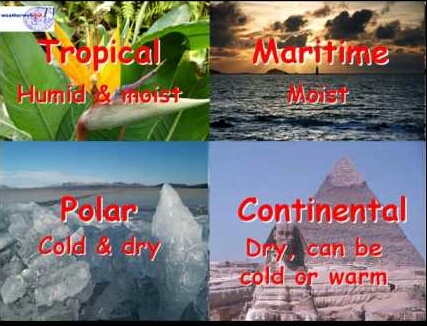 Il existe plusieurs types de masses d'air, où chaque type de masse d'air produit un temps différent qui peut affecter le climat de la Terre pendant des jours ou des mois, et ces types sont :
