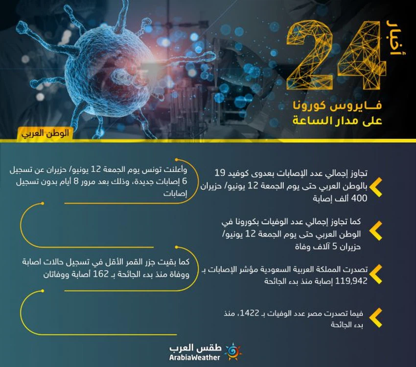 طقس العرب- لا يزال العالم بما في ذلك الدول العربية تشهد تسجيًلا للاصابات والوفيات بسبب فيروس كورونا "كوفيد-19"، حيث تجاوز إجمالي عدد الإصابات بفيروس كورونا في الوطن العربي منذ بدء الجائحة 400 ألف إصابة، فيما تجاوز إجمالي عدد الوفيات 5 آلاف حالة، يوم الجمعة 12 حزيران/ يونيو 2020.