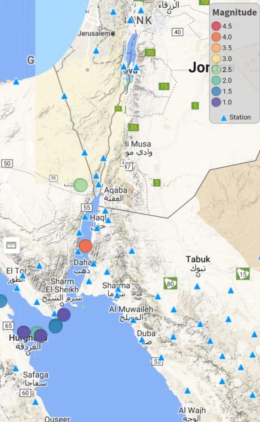 ويبعد الزلزال وفق سويدان 110 كم جنوب مدينة العقبة/خليج العقبة.
