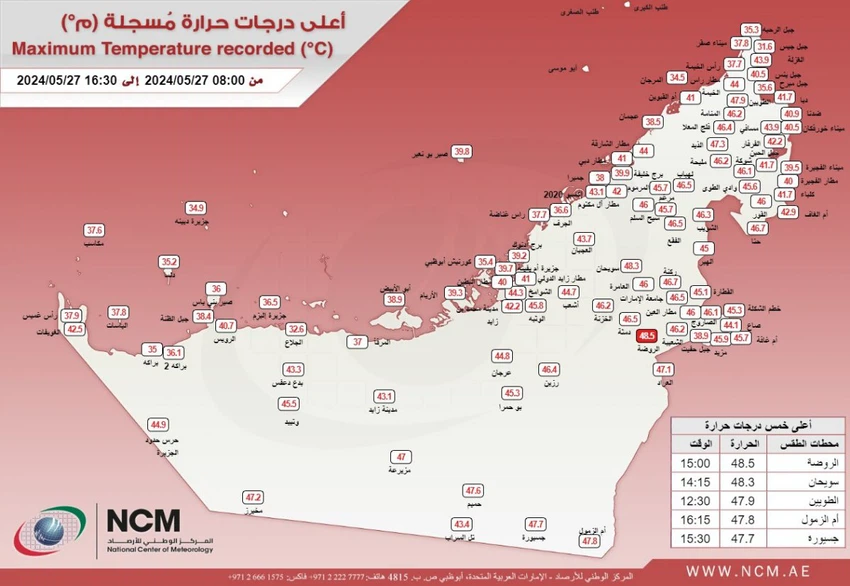 طقس العرب - سجلت منطقة الروضة في مدينة العين قبل قليل درجات حرارة مرتفعة للغاية بلغت 48.5 درجة مئوية، حسب ما صدر من المركز الوطني للأرصاد، وحسب الخريطة المرفقة.