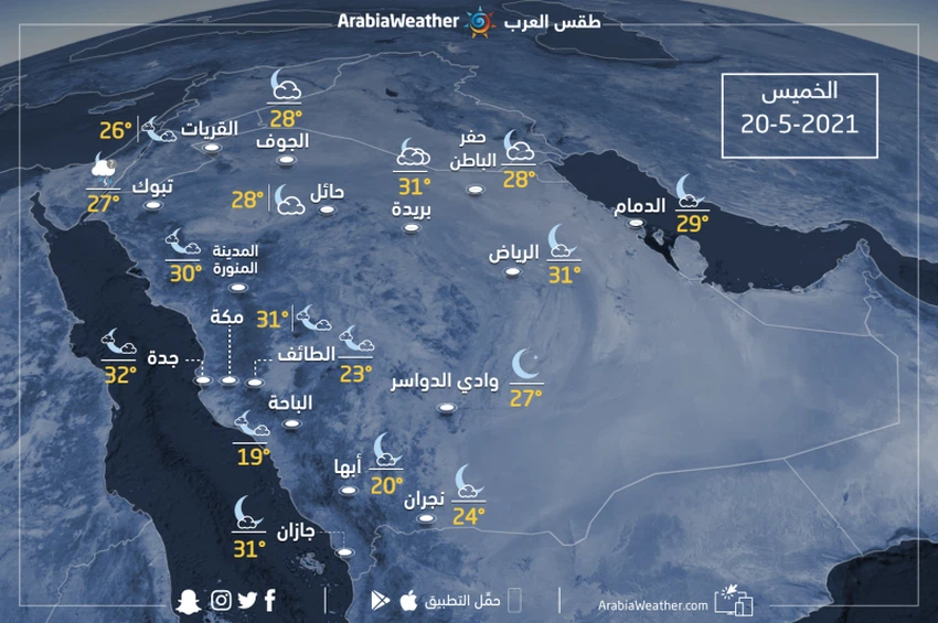 حالة الطقس ودرجات الحرارة المتوقعة في السعودية يوم الخميس 20-5-2021