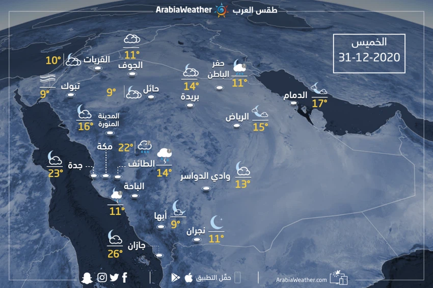 حالة الطقس ودرجات الحرارة المتوقعة في السعودية يوم الخميس 31-12-2020