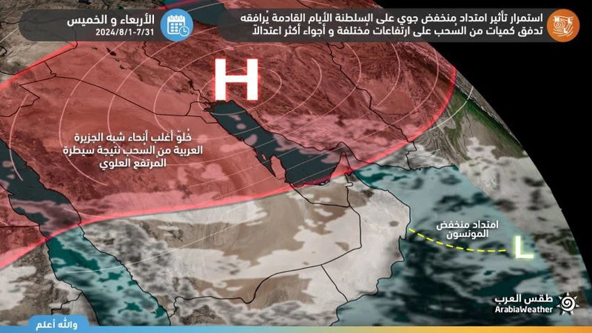 طقس العرب - تُشير أحدث نواتج المُحاكاة الحاسوبية في مركز طقس العرب توقعات بأن يستمر تأثر أجواء السلطنة خلال الأيام القادمة بامتداد لمنخفض المونسون من الشرق مع نشاط للفاصل المداري الوهمي جنوب منطقة شبه الجزيرة العربية، و يتزامن ذلك مع ابتعاد نسبي في تأثير المُرتفع الجوي الموسمي في طبقات الجو العالية.