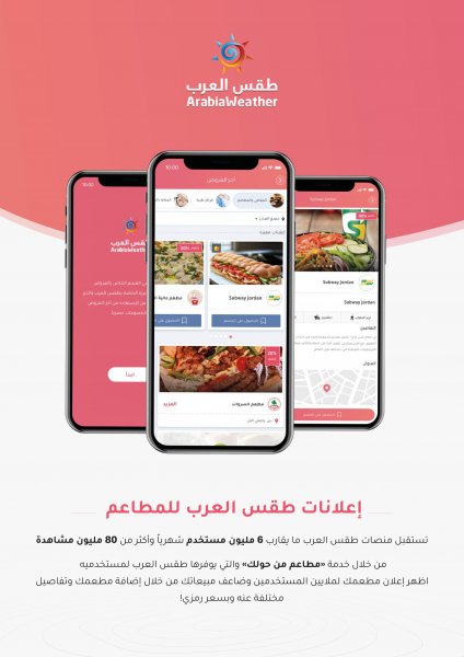 خدمة " طقس العرب GO " تساعد المستخدمين للتعرف على الأماكن من حولهم بمختلف القطاعات والمجالات وما توفره هذه الأماكن من منتجات وخدمات مختلفة كما وتتيح لصاحب المكان إضافة العروض الخاصة به على الخدمة ليتمكن المستخدمين من معرفتها وبالتالي زيادة مبيعاته من خلال هذه العروض