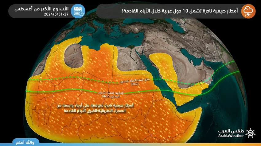 من مركز طقس العرب - تُشير أحدث نواتج المُحاكاة الحاسوبية في مركز طقس العرب إلى توقعات بأن تشهد 10 دول عربية اضطرابات جوية خلال ما تبقى من شهر أغسطس، بما في ذلك أنحاء واسعة من الصحراء الإفريقية الكبرى و هي التي تُعتبر أكثر المناطق جفافاً في العالم، وسط مؤشرات إلى استمرار هذه الاضطرابات خلال شهر سبتمبر بإذن الله.