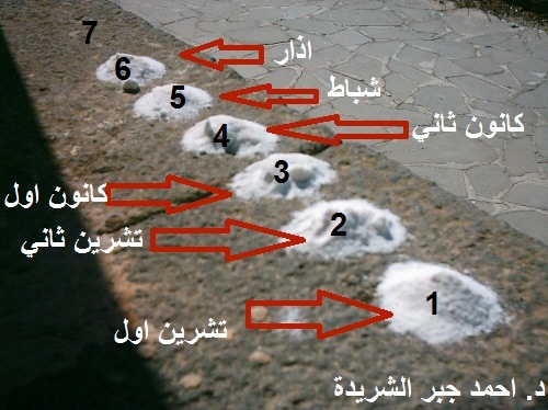 وعندما يستيقظون في الصباح الباكر لرؤية (صبابير) الملح الصغيرة، يبدؤون العد من قبضة الشهر الأول أي تشرين الأول، وهكذا.. فإن كانت إحدى هذه القبضات تغير لونها وسال ماؤها فهو شهر شتاء وفير.ويمكن أن يعلموا أي الأشهر فيها شتاء، وأخرى شتاؤها ضعيف عن طريق الماء الموجود في الملح أو أمامه.
