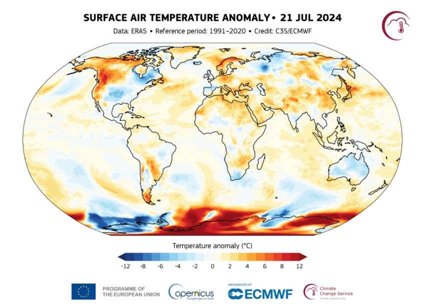 طقس العرب-أعلنت خدمة "كوبرنيكوس" لمراقبة تغير المناخ التابعة للاتحاد الأوروبي أن يوم الأحد، 21 يوليو، كان الأشد حرارة على مستوى العالم وفقًا للبيانات الأولية، وبلغ متوسط درجة الحرارة العالمية القريبة من السطح في ذلك اليوم 17.09 درجة مئوية، متجاوزًا الرقم القياسي السابق المسجل في يوليو من العام الماضي بـ17.08 درجة مئوية.