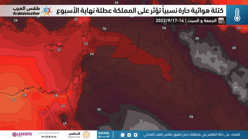 طقس العرب - يُتوقع استمرار تدفق تيارات غربية بحرية رطبة إلى المنطقة الشرقية من حوض البحر الأبيض المُتوسط بما فيها المملكة يوم الخميس والتي ستعمل على بقاء درجات الحرارة دون مُعدلاتها الاعتيادية لمثل هذا الوقت من مُنتصف أَيلول بِحُدود درجتين مئويتين وبالتالي سيادة أجواء خريفية مُعتدلة نهاراً وخاصةً في الجبال وتكون لطيفة ورطبة ليلاً بمشيئة الله.