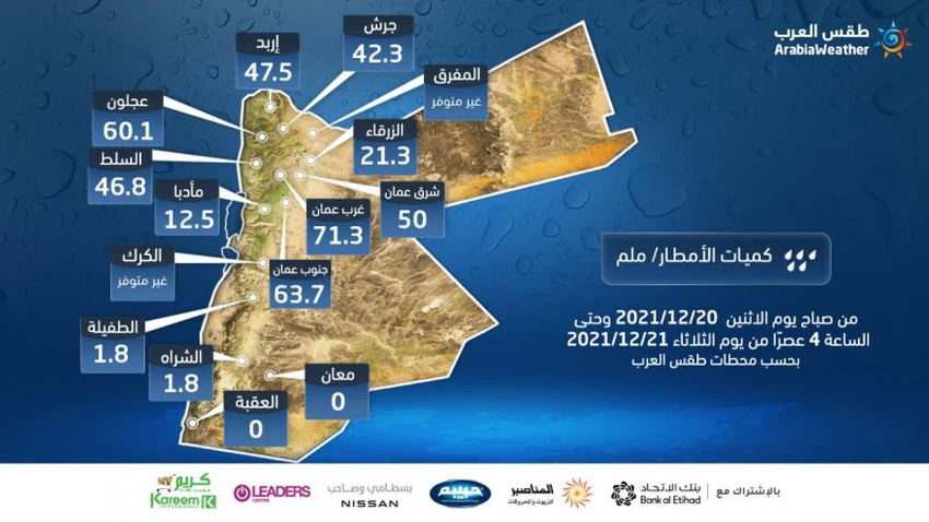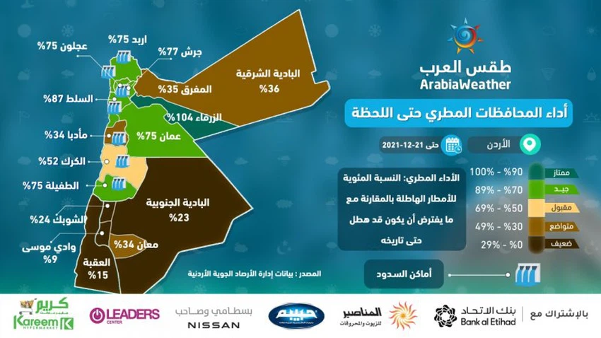 حيثُ ومع دخولنا في مربعانية الشتاء 2021/2022 وتزامن ذلك مع تأثيرات منخفض جوي من الدرجة الثالثة، أظهرت أيضاً بيانات الأمطار الاحصائية الصادرة عن ادارة الأرصاد الجوية الأردنية تحسنا ملحوظا في الأردن المطري بالرغم من ان كميات الامطار التراكمية لا زالت دون المعدل.