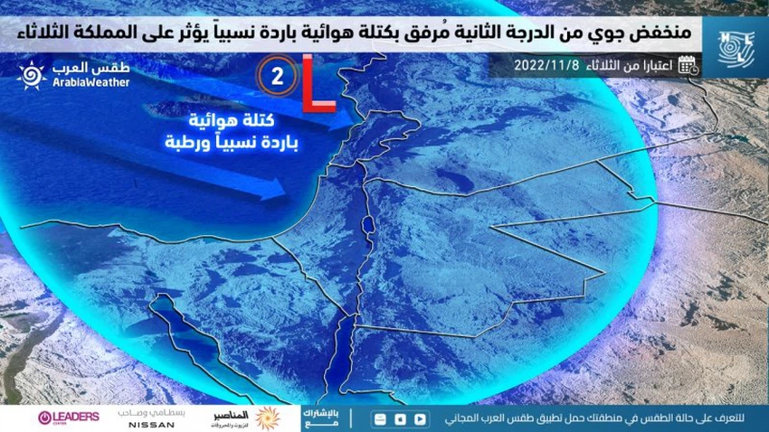 طقس العرب - تُشير خرائط التنبؤات الجوية بأن المملكة ستتأثر بمشيئة الله يوم الثلاثاء بمُنخفض جوي في طبقات الجو كافة سيتخذ من غرب لبنان مركزاً سطحياً له، و مُرفق بكتلة هوائية باردة نسبياً و رطبة، يجلب هطولات مطرية للعديد من المناطق بإذن الله وسط انخفاض ملموس على درجات الحرارة.