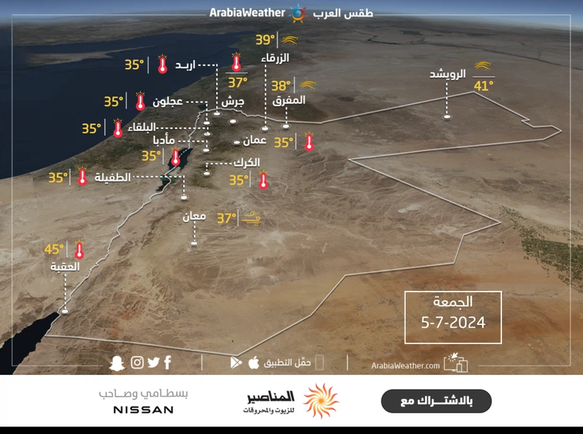 • درجة الحرارة العظمى المتوقعة في العقبة: °45