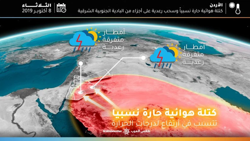 تندفع نحو المملكة كتلة حارة نسبياً قادمة عبر السعودية، حيث يطرأ ارتفاع واضح على درجات الحرارة وتكون الأجواء حارة نسبياً وجافة أثناء ساعات النهار في معظم المناطق، نتيجة لامتداد منخفض البحر الاحمر وهبوب رياح جنوبية شرقية معتدلة السرعة، تنشط فوق الجبال.