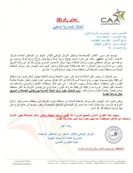 طقس العرب - أصدرت الأرصاد العمانية قبل قليل التحذير رقم 6 حول آخر مستجدات وتطورات اعصار شاهين في بحر عُمان، وفيما يلي نص التحذير: