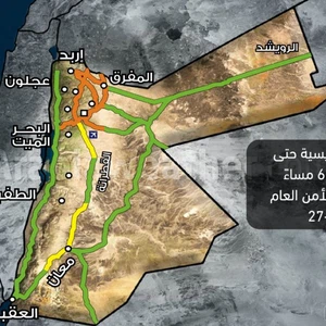طقس العرب - أعلنت مديرية الأمن العام في الأردن حالة الطرق حتى الساعة السادسة مساء اليوم الخميس 27/1/2022 على النحو التالي: