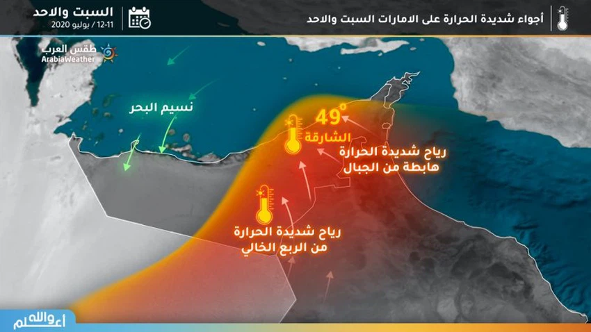 طقس العرب - من المُتوقع أن تتأثر دولة الإمارات، وبشكل خاص كُل من دبي و الشارقة وعجمان يومي الجمعة و السبت بارتفاع حاد وكبير على درجات الحرارة، إذ يُتوقع أن تقترب من 50 درجة مئوية على غير العادة.