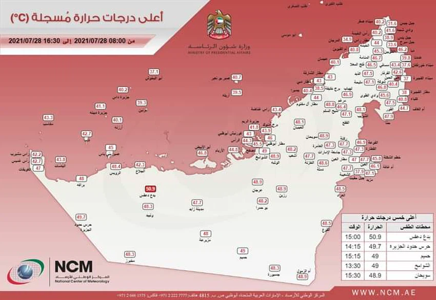 رصدت محطات الرصد الجوي في بدع دعفس (منطقة الظفرة) اعلى درجة حرارة في الدولة لهذا اليوم بواقع 50.9 درجة مئوية عند الساعة 15:00 بالتوقيت المحلي لدولة الإمارات.