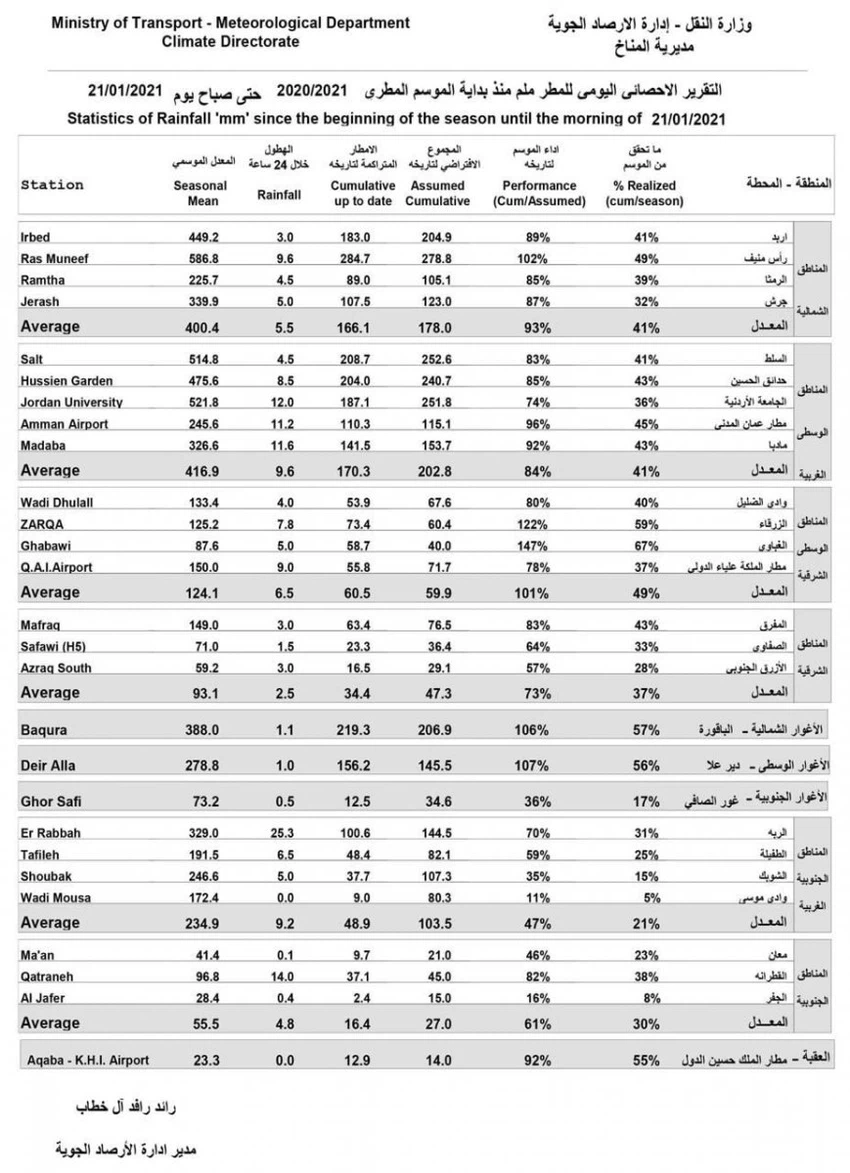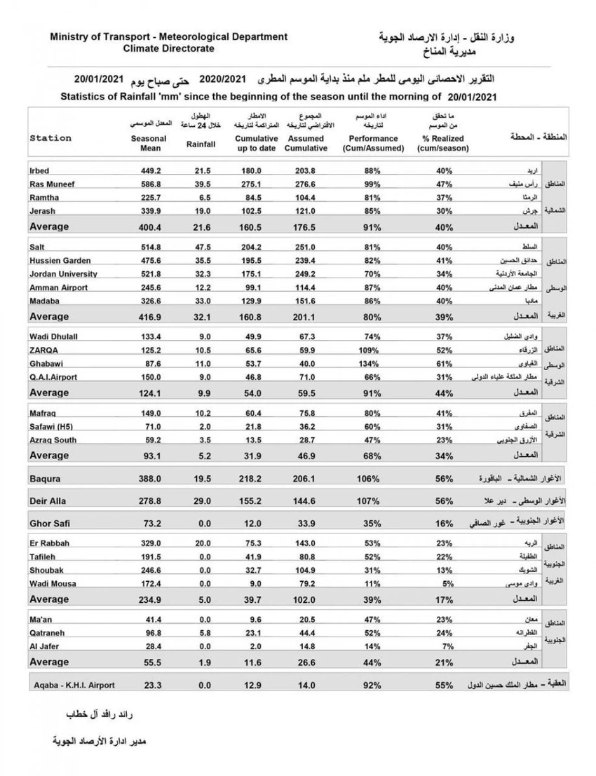 وتاليًا تقرير لكميات الأمطار المُصدرة من الأرصاد الأردنية خلال فترة تأثير المُنخفض الجوي الأخير: