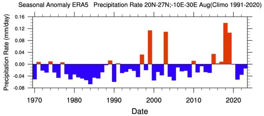 يقول المختصون الجويون في "طقس العرب"، أن أكثر من نصف الصحراء الكبرى يتلقى هطول أمطار أقل من 25 ملم من الأمطار على مدار العام، لكن مع تحرك الفاصل المداري أكثر باتجاه الشمال قد تتلقى عديدة من المناطق هناك أكثر من 1000% من المعدل العام ومنها سيبلغ الحد الأقصى، ويوضح الرسم البياني التالي لهطول الأمطار فوق الصحراء الكبرى، لشهر أغسطس شذوذ الأمطار لأشهر أغسطس على مدار السنوات الـ 53 الماضية، ونلاحظ وجود 4 سنوات فقط أظهرت شذوذًا قويًا، أي أن هذا الأمر حدث أربع مرات في العقود الخمسة الماضية فقط.