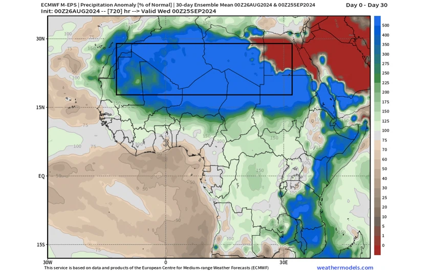 وبالنظر إلى شذوذ هطول الأمطار، حيث تشير التوقعات الخاصة بشذوذ هطول الأمطار أن جزءًا كبيرًا من الصحراء الكبرى سوف يشهد شذوذًا واسع النطاق في هطول الأمطار خلال الأسبوعين المقبلين وربما بعد ذلك، قد يصل إلى الحد الأقصى عند 500% عن المعدل العام و أكثر من 1000% من معدل هطول الأمطار الطبيعي في المناطق الوسطى.