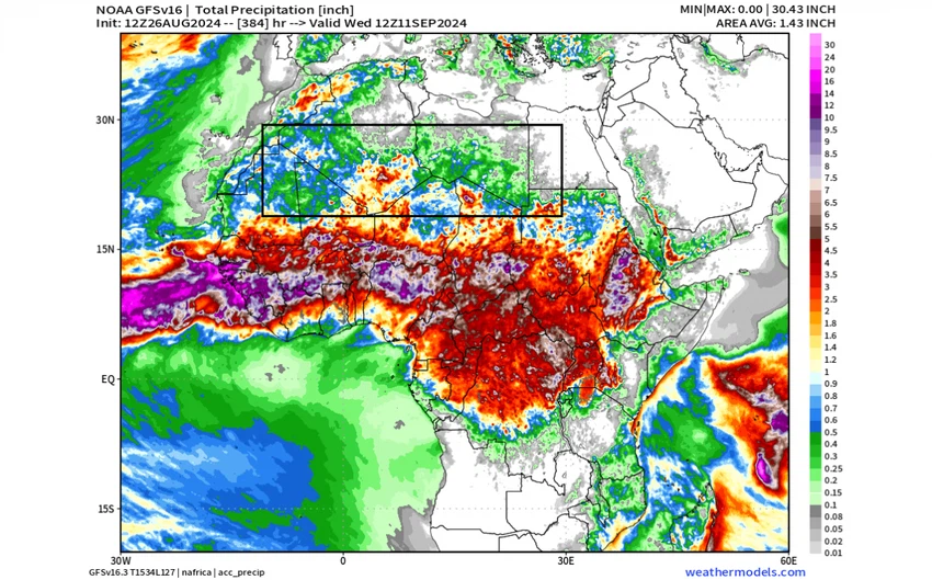 طقس العرب -تشير أحدث مخرجات النماذج العددية في مركز "طقس العرب"، أن منطقة الصحراء الكبرى والمعروفة بأنها أكثر الأماكن جفافًا على وجه الأرض، قد تشهد حدثاً فريداً من نوعه خلال الأيام والأسابيع القادمة، حيث أنه من المتوقع أن تشهد أجزاء واسعة من الصحراء الكبرى على أكثر من 500% من معدل هطول الأمطار الشهري الطبيعي في شهري أغسطس وسبتمبر.