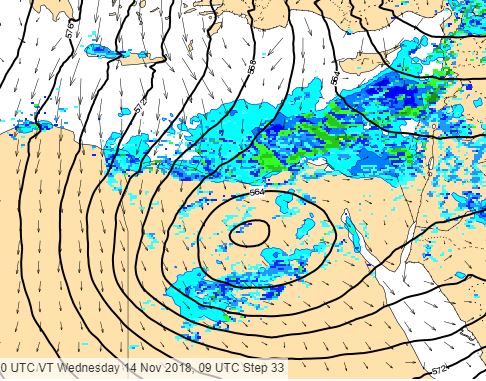 وهذا تشابهاً مع الحالة السابقة بسبب عبور منخفض علوي بارد الذي يتحرك باتجاه الشرق قادماً من البحر المتوسط، والذي يجلب كتلة باردة مع امداد الرطوبة بطبقات الجو المختلفة من مخفض البحر الأحمر الذي يتطور خلال اليوم وغداً ويعمل ذلك على تكاثُف السُحب المتوسطة والركامية التي ينتج عنها هطول الأمطار مع فترة الصباح حتى المساء.