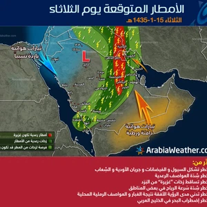 تتساقط الزخات الرعدية التي قد تكون غزيرة احيانا، خطر السيول متوقع خاصة مجاري الاودية والشعاب، كذلك يحذر من زخات البرد واثار الرياح الهابطة.