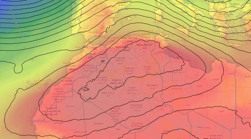طقس العرب - ما زالت تتأثر الأجزاء الجنوبية والوسطى وصولاً إلى الأجزاء الشمالية الشرقية من الجزائر بكتلة هوائية حارة اندفعت من الصحراء الكبرى، ومن المُنتظر انتشارها نحو عموم مناطق الجزائر خلال الأيام القادمة، إذ وبحسب أخر التحديثات الجوية يُتوقع استمرارها حتى منتصف الأسبوع المقبل، ليس ذلك فحسب انما يتزامن اندفاع الكتلة الحارة مع تواجد لكُتلة هوائية باردة في الجزء الغربي من البرتغال واسبانيا ونواحي المحيط الأطلسي الأمر الذي عمل على حصر الكُتلة الهوائية الحارة لفترة زمينة أطول مع اشتدادها وهذا ما هو مُتوقع خلال الأيام القادمة بمشيئة الله.