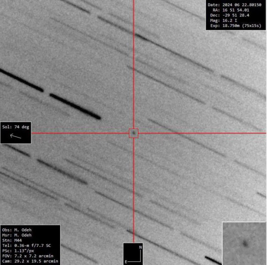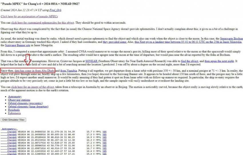 طقس العرب - قال م. محمد عودة عضو الجمعية الفلكية الأردنية ومدير مركز الفلك الدولي إن مرصد الختم الفلكي الكائن في صحراء أبوظبي تمكن ليلة أمس السبت 22 يونيو 2024 من تصوير المسبار الصيني (Chang'e 6) أثناء رحلة عودته من القمر باتجاه الأرض.