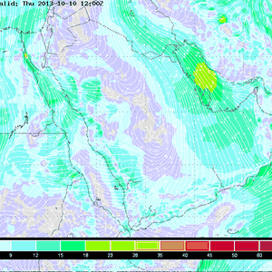 كذلك تنخفض سرعة الرياح مقارنة مع يوم الأربعاء، وينحصر نشاطها على شرق البلاد ومنطقة الخليج العربي مسببة الاضطراب للبحر و إثارة العوالق الترابية.