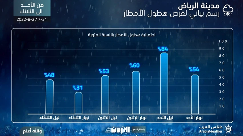 وفي التفاصيل، تُشير آخر مخرجات أنظمة المُحاكاة الحاسوبية للأنظمة الجوية وتوقعات الأمطار إلى تأثر منطقة الرياض بما فيها العاصمة بتقلبات جوية تُعتبر الأفضل منذ سنوات مُقارنة بهذا الوقت من العام، حيث يُتوقع أن تتأثر بكتلة هوائية ذات رطوبة عالية قادمة من بحر العرب، تعمل على نشوء أحوال جوية غير مستقرة في عُموم منطقة الرياض ادارياً بما فيها العاصمة، وذلك اعتبارا من مساء يوم السبت، على أن تزداد شدة يوم الأحد وتستمر حتى الأربعاء على أقل تقدير.
