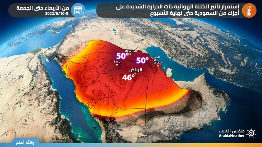 وفي التفاصيل فيُتوقع أن يشتد تأثر الموجة الحارة على القطاع الشمال من المنطقة الشرقية، إذ يُتوقع أن تسجل أجزاء من حفر الباطن والقيصومة والنعيرية درجات حرارة تلامس حاجز الـ 50 درجة يومي الأربعاء والخميس، وفي الوقت ذاته يتعمق تأثير الموجة الحارة لتشمل العاصمة الرياض، ويتوقع ان ترتفع درجات الحرارة فيها لتصبح مابين 46-45 درجة مئوية.