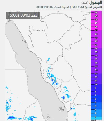 طقس العرب - تُشير آخر الخرائط الجوية توقعات باستمرار نشاط السُحب الركامية على المرتفعات الجنوبية الغربية فترة ما بعد الظهر و المساء من يوم الأحد، و تشمل بذلك مرتفعات شرق جازان و عسير و الباحة و شرق مكة المكرمة وصولاً لجنوب المدينة المنورة، و يرافقها هطول أمطار مُتفرقة يصحبها حدوث الرعد و نشاط في الرياح الهابطة.