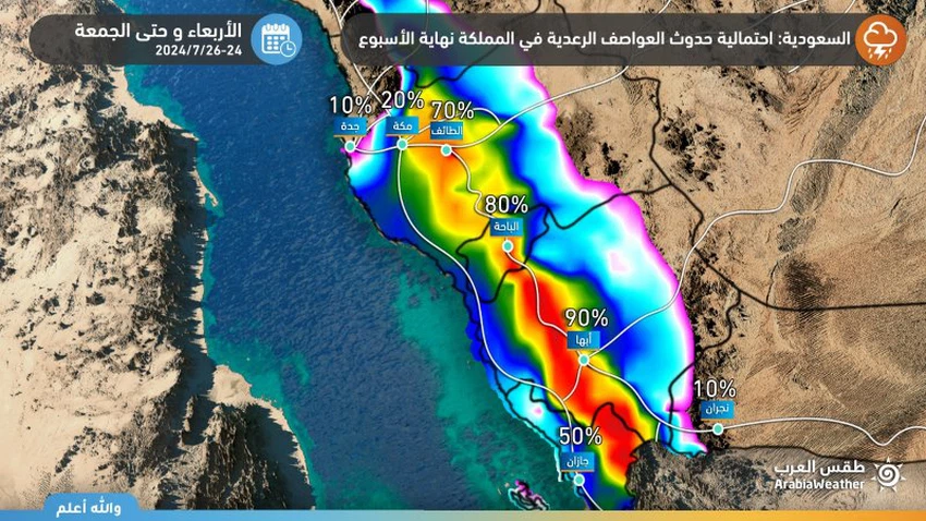 و قال المُتنبئون الجويون في مركز طقس العرب بأنه يُتوقع أن تتدفق كتل هوائية رطبة للغاية للمنطقة الجنوبية الغربية من المملكة بدءاً من نهاية الأسبوع و يستمر هذا التدفق لِعّدة أسابيع و هو مرافق لتقدم ما يعرف بالفاصل المداري الوهمي (ITCZ)، بحيث تتكاثر السُحب الركامية فترة ما بعد الظهر و المساء على مُرتفعات جازان و عسير و الباحة و وصولاً لشرق مكة المكرمة و الطائف و تتسبب بهطول أمطار رعدية مُتفاوتة الغزارة قد يصحبها تساقط البَرَديات في بعض النطاقات، مما يؤدي إلى جريان كبير للأودية و الشعاب و ارتفاع منسوب المياه.