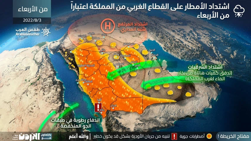 طقس العرب - سنان خلف - توقع كادر التنبؤآت الجوية في مركز طقس العرب الإقليمي اندفاع لكميات كبيرة من الرطوبة وبخار الماء من منطقة بحر العرب وشرق أفريقيا باتجاه القطاع الغربي من المملكة، والتي ستكون بمثابة الوقود والداعم الرئيسي لتشكل سُحب ركامية رعدية قوية في مناطق واسعة من غرب المملكة خلال الأيام القادمة.