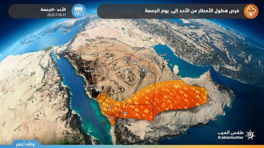 وفي التفاصيل فيُتوقع بمشيئة الله اعتباراً من يوم الثلاثاء أن تعبر سماء الربع الخالي تيارات هوائية رطبة قادمة بحر العرب، تزامناً مع تعمق المنخفض الجوي الحراري الواقع في الجنوب الشرق للمملكة السعودية، ما يعمل على نشوء اضطرابات تتشكل على اثرها السحب الركامية الرعدية وتساقط الأمطار بشدة متفاوته.