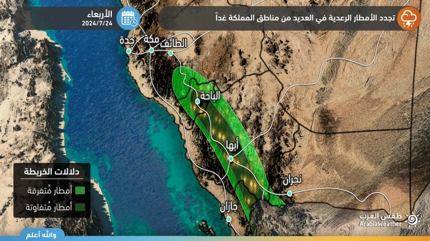 طقس العرب - تُشير أحدث قراءات الخرائط الجوية في مركز طقس العرب توقعات بأن تتجدد الأمطار الرعدية في مناطق عِدّة من جنوب غرب المملكة يوم الأربعاء 2024/7/24 و ذلك نتيجة تدفق رطوبة مدارية نحو المنطقة و هي مرافقة لاندفاع ما يُعرف بالحزام المداري الوهمي لجنوب شبه الجزيرة العربية.