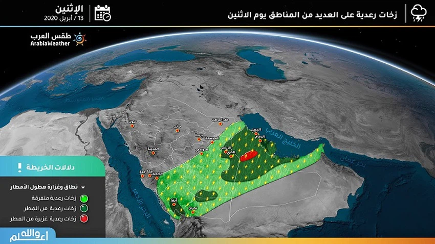 طقس العرب - تتأثر العديد من مناطق المملكة ليلة الأحد/الإثنين ونهار الإثنين بحالة من عدم الإستقرار الجوي، تكون ما بين المتوسطة والقوية في بعض المناطق.