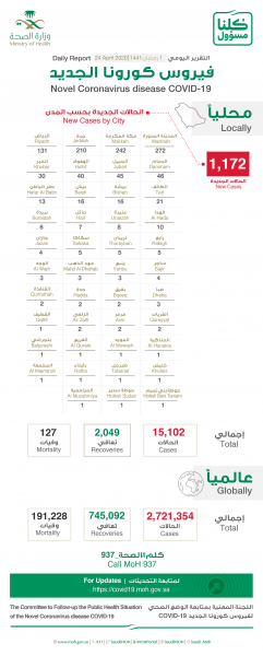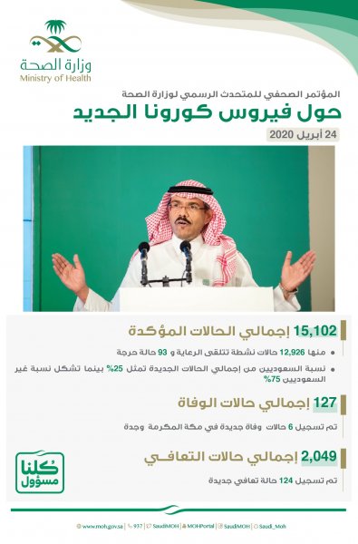 طقس العرب - أعلنت وزارة الصحة السعودية عبر المؤتمر الصحفي لوزارة الصحة حول مستجدات كورونا عن تسجيل 1172 إصابة جديدة بالفايروس كورونا في المملكة ليرتفع إجمالي المصابين إلى 15,102 إصابة