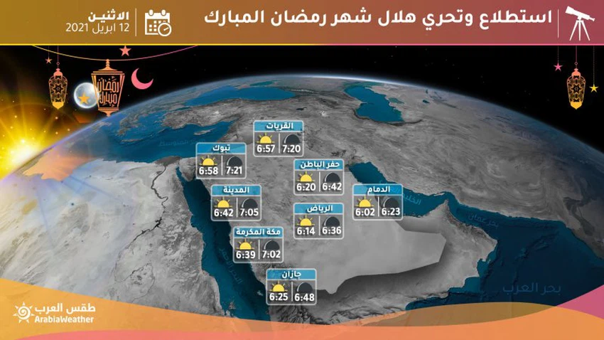 طقس العرب - سنان خلف - متى يبدأ رمضان؟ أو متى سيكون أول أيام شهر رمضان 2021-1442 فى السعودية، هل يغرب القمر بعد الشمس هذه الليلة؟ وكم سيكون عُمر الهلال وقت الغروب؟ وهل ستكون رؤية الهلال ممكنة؟