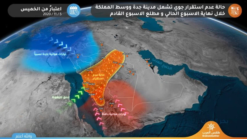 ويُتوقع بمشيئة الله أن يندفع حوض علوي بارد من شرق البحر المتوسط نحو شمال البحر الاحمر، بالتزامن مع هبوب لتيارات جنوبية دافئة و رطبة من جنوب البحر الأحمر ، حيث تلتقي هاتين الكتلتين فوق المنطقة الممتدة من سواحل جدة وصولا الى منطقة الحدود الشمالية مرورا بالمرتفعات مكة المكرمة و غرب منطقة الرياض والقصيم و حائل ، حيث ستشهد هذه المناطق حالة من عدم استقرار جوي وفرصة لهطول زخات رعدية من المطر متفاوتة الشدة.
