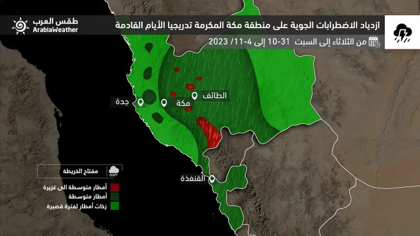 و بناءً على ما سبق، من المُنتظر أن ترتفع فرص تشكل السُحب الركامية فترة ما بعد الظهر و المساء من يوم الأربعاء 1-11-2023 على أجزاء عِدّة من مكة المكرمة بما فيها الطائف و يُحتمل أن تطال السُحب الركامية المشاعر المقدسة و بخاصة فترة المساء و يُرافقها هطول أمطار مُتوسطة قد يتخللها بؤر غزيرة في بعض النطاقات الجغرافية، مع حدوث العواصف الرعدية أحياناً و نشاط في التيارات الهابطة و تؤدي إلى جريان الأودية و الشعاب. و لا يُستبعد أن تمتد بعض السُحب الماطرة لأجزاء من المناطق الساحلية للمنطقة خاصة ساعات الليل و لكن تكون أضعف.