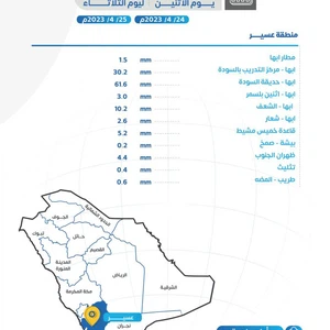 طقس العرب - سنان خلف - سجلت حديقة السودة في أبها تساقط 61 ملم من الأمطار خلال الـ 24 ساعة الماضية، لتتصدر بذلك قائمة أعلى مناطق المملكة هطلاً للأمطار خلال الـ 24 ساعة الماضية.