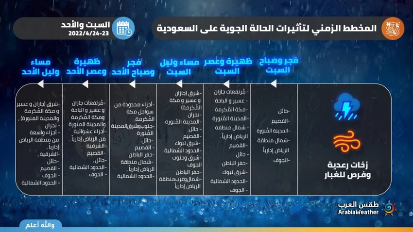 فريق طقس العرب وبعد تحليل كافة المعلومات الواردة من خلال فريق التنبؤات قام باعداد هذا التصميم الذي يُوضح التسلسل الزمني للحالة الماطرة خلال يومي السبت والأحد بمشيئة الله: