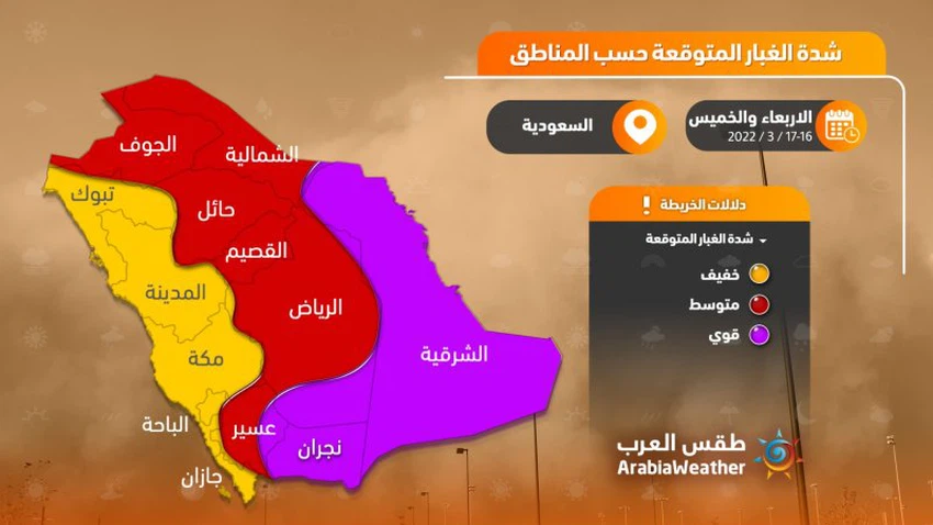 طقس العرب - توقع كادر التنبؤات في طقس العرب أن تتأثر أجزاء واسعة من السعودية نهاية الأسبوع الحالي بموجات غُبارية وعواصف رملية وتُعتبر الأقوى والأكثر امتداداً وتأثيراً منذ بداية الموسم.
